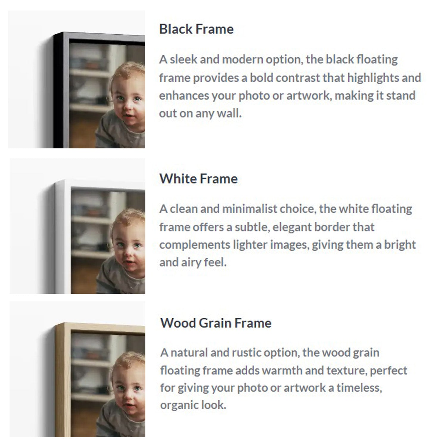 The Rectangle Floating Frame is available in five sizes. The high-quality canvas print is inside a 4cm thick floating frame that is available in white, black or woodgrain. A contemporary and stylish way to showcase your chosen print.